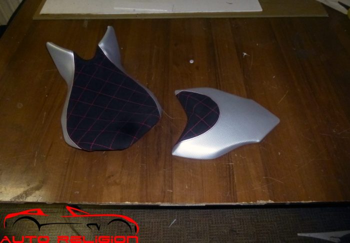 Перетяжка сидений эко кожей в два цвета с декоративной прострочкой «ромбами».