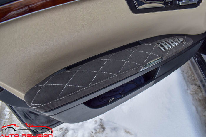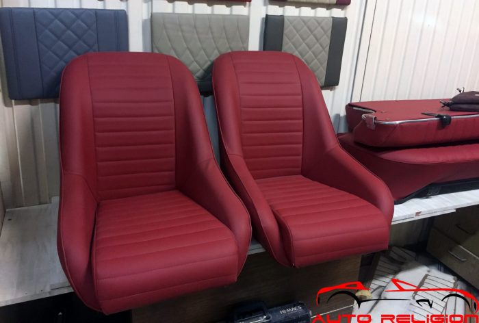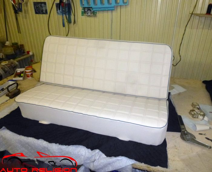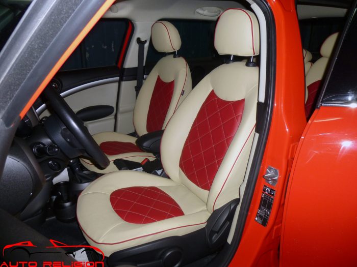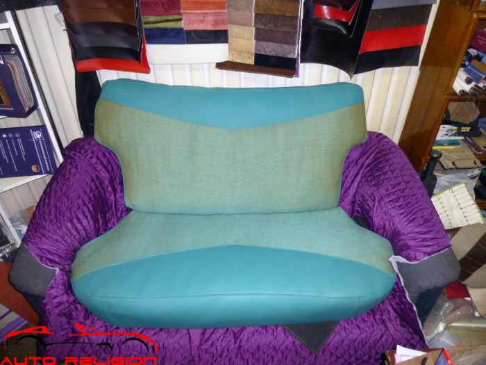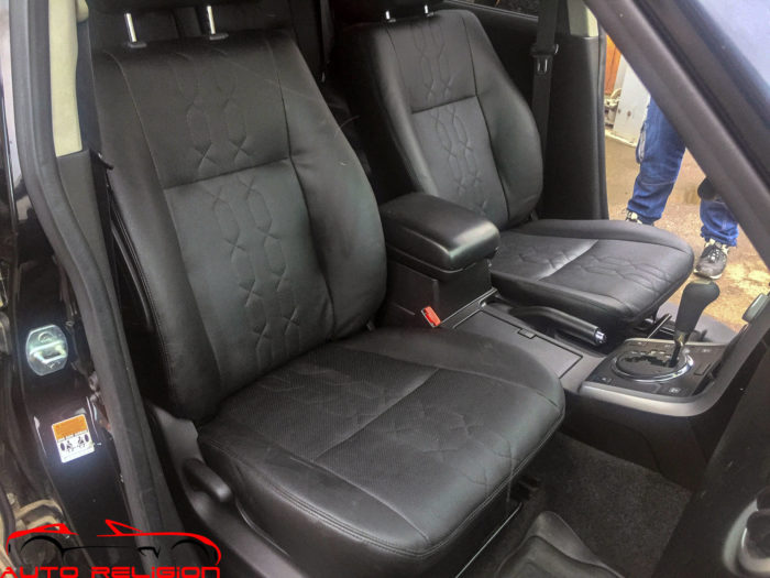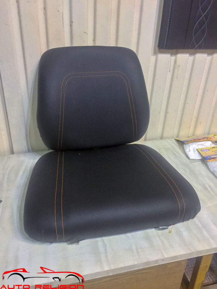 Перетяжка сидений эко кожей в два цвета с декоративной прострочкой «ромбами».