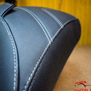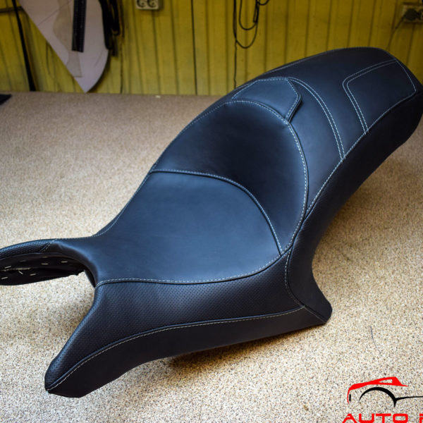 • Перетяжка мотосидения в итальянскую натуральную кожу Наппа. Перетяжка выполнена в комбинации гладкая кожа + перфорация.