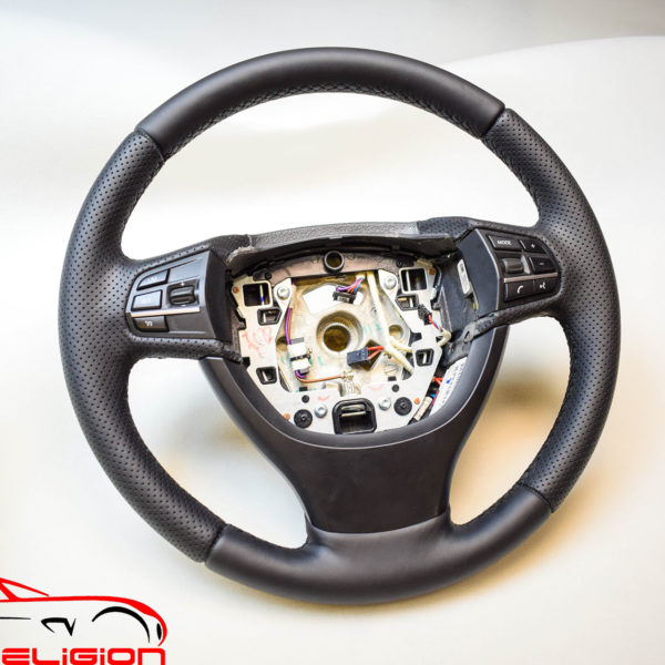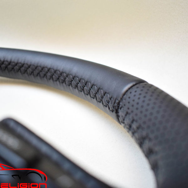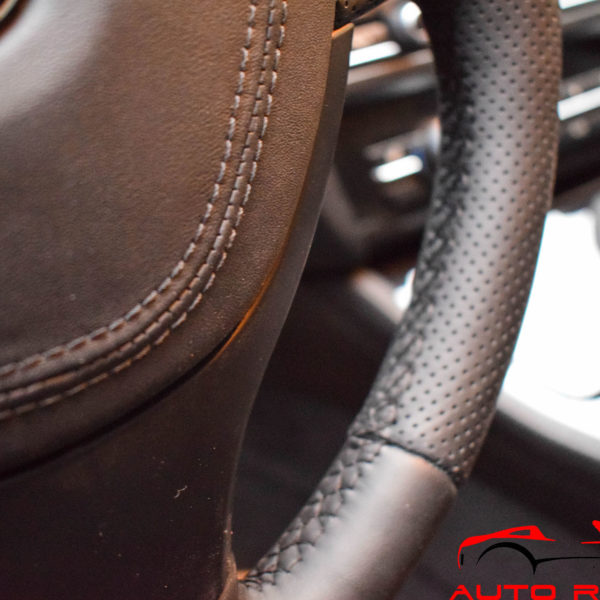 Перетяжка руля выполнена в натуральную итальянскую кожу Наппа Феррари. Сделана комбинация гладкой и перфорированной кожи. Подушка безопасности перетянута с декоративной отстрочкой, использованием подложки и специальных прорезей на коже для сохранения безопасности.